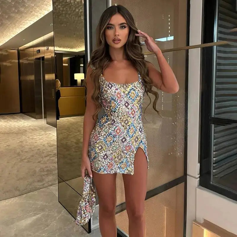 Colorful Diamond Pattern Sequin Slit Mini Dress