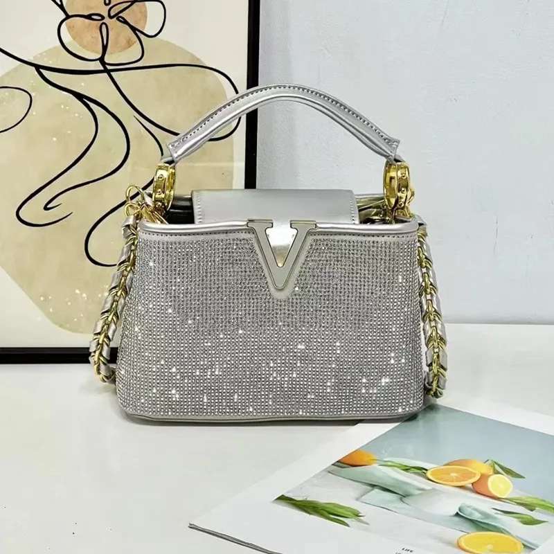 Sparkle and shine with the Top Handle Crystal Handbag! This playful accessory dazzles with shimmering crystals and a chic top handle, making it the perfect statement piece to carry your essentials with a touch of fun and glamour. Ready to brighten up any outfit and occasion!