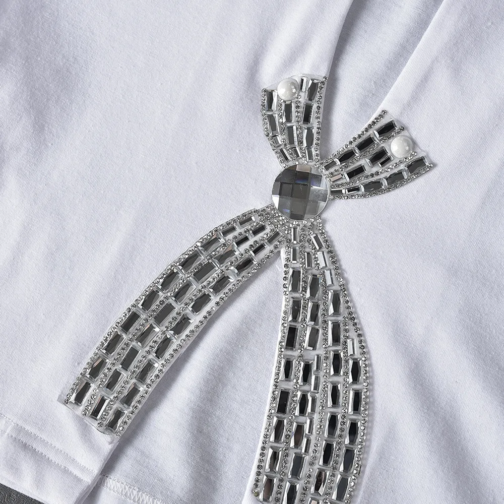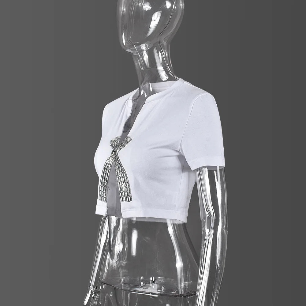 Sparkle and shine in this Rhinestone Bowknot Short Sleeve T-shirt! With its playful bowknot detail adorned in shimmering rhinestones, this tee adds a fun and flirty touch to your casual outfits. Comfortable and eye-catching, it’s perfect for brightening up any day.