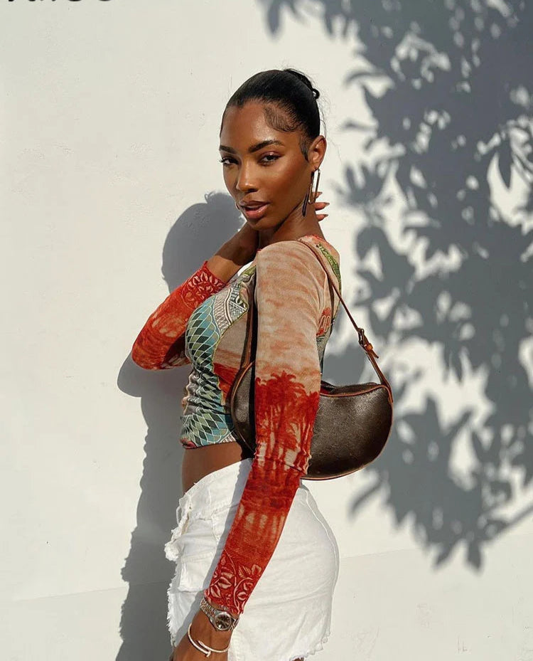 Mesh Dollar Print Classic Aesthetic O-neck Long Sleeve Skinny Top