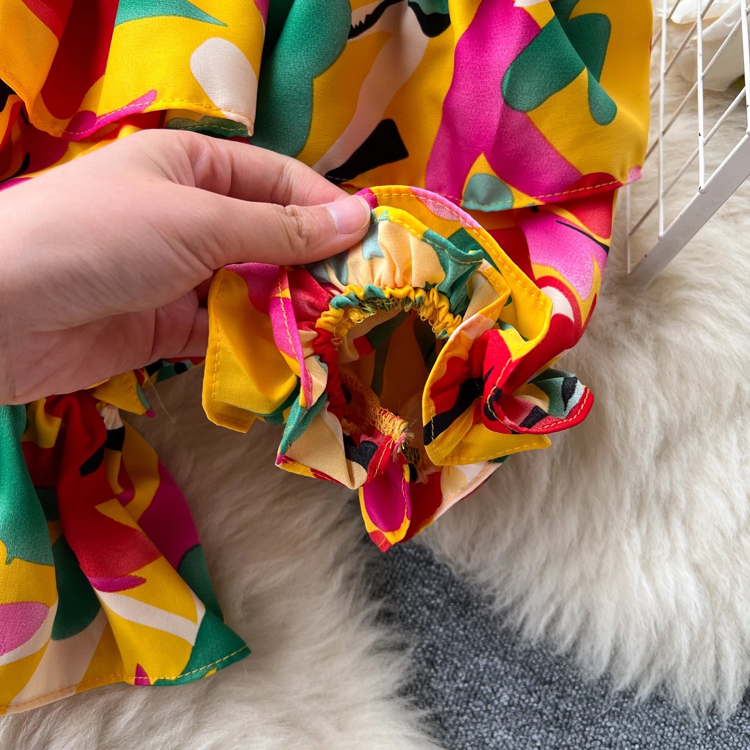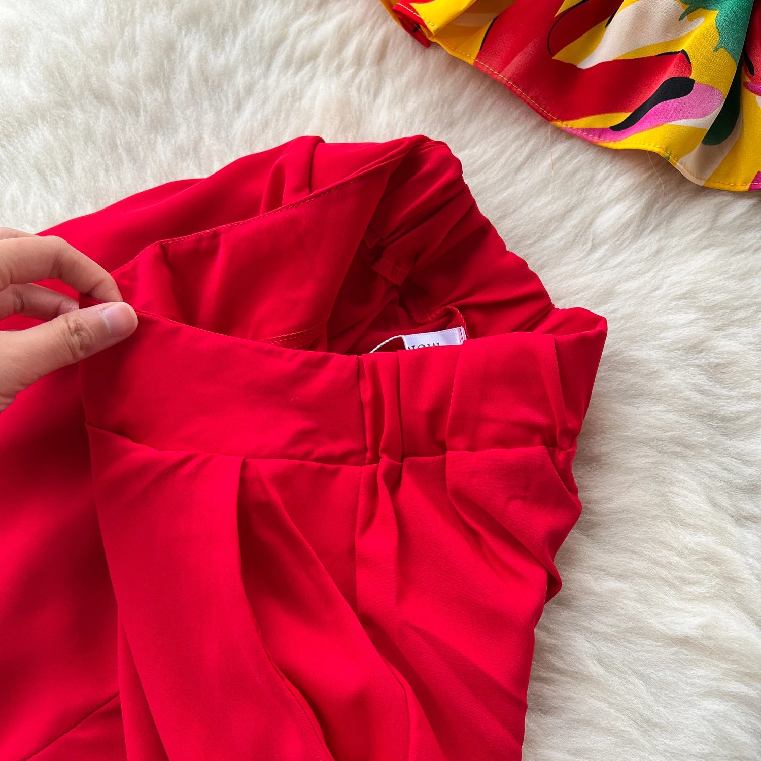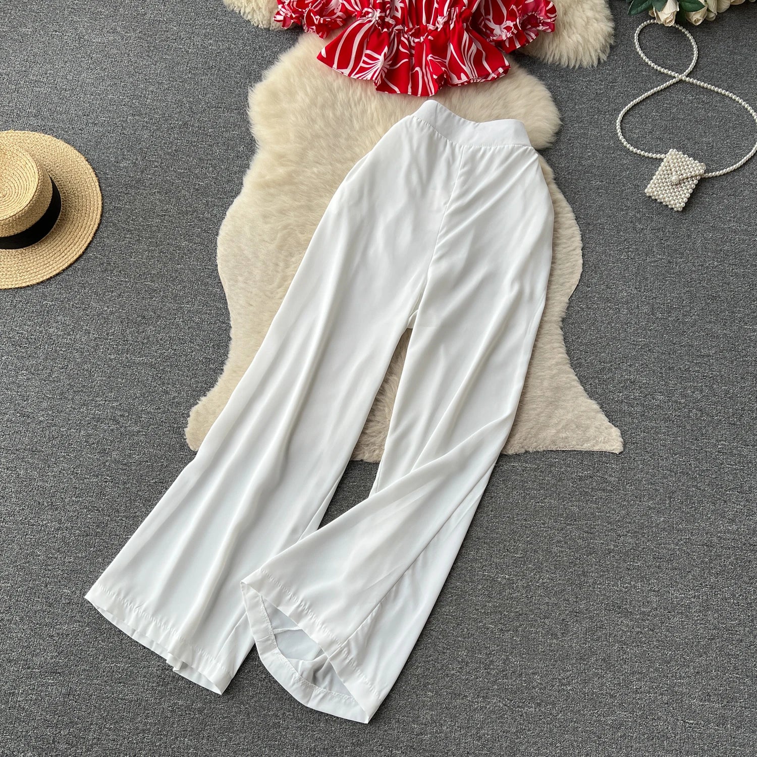Ruffles Floral Print Elastic Waist Wide Leg Long Pants+Top Set