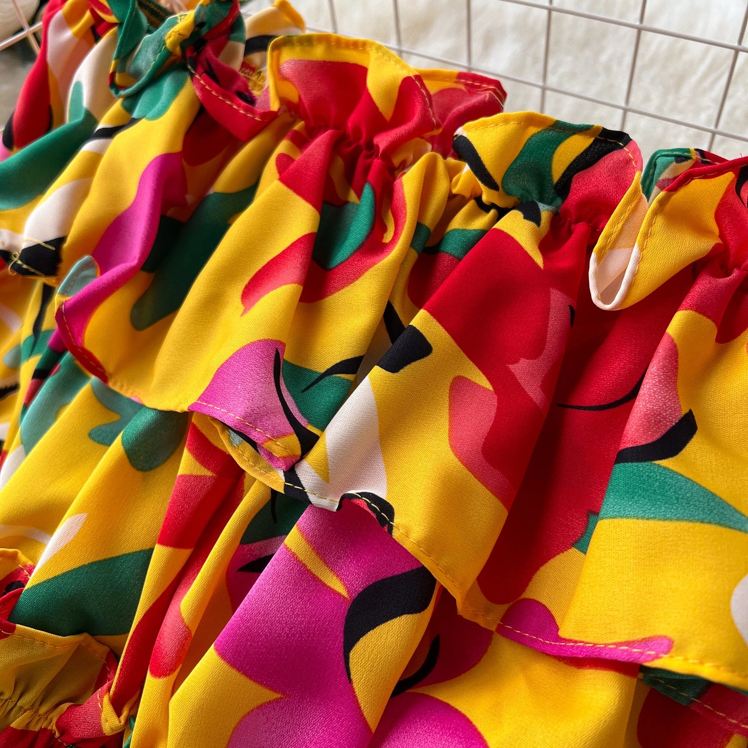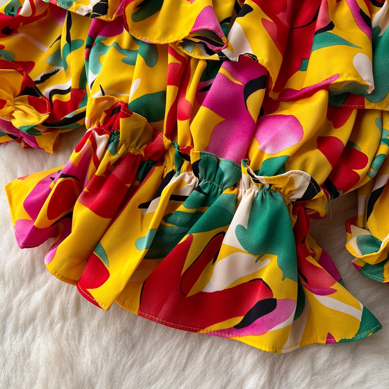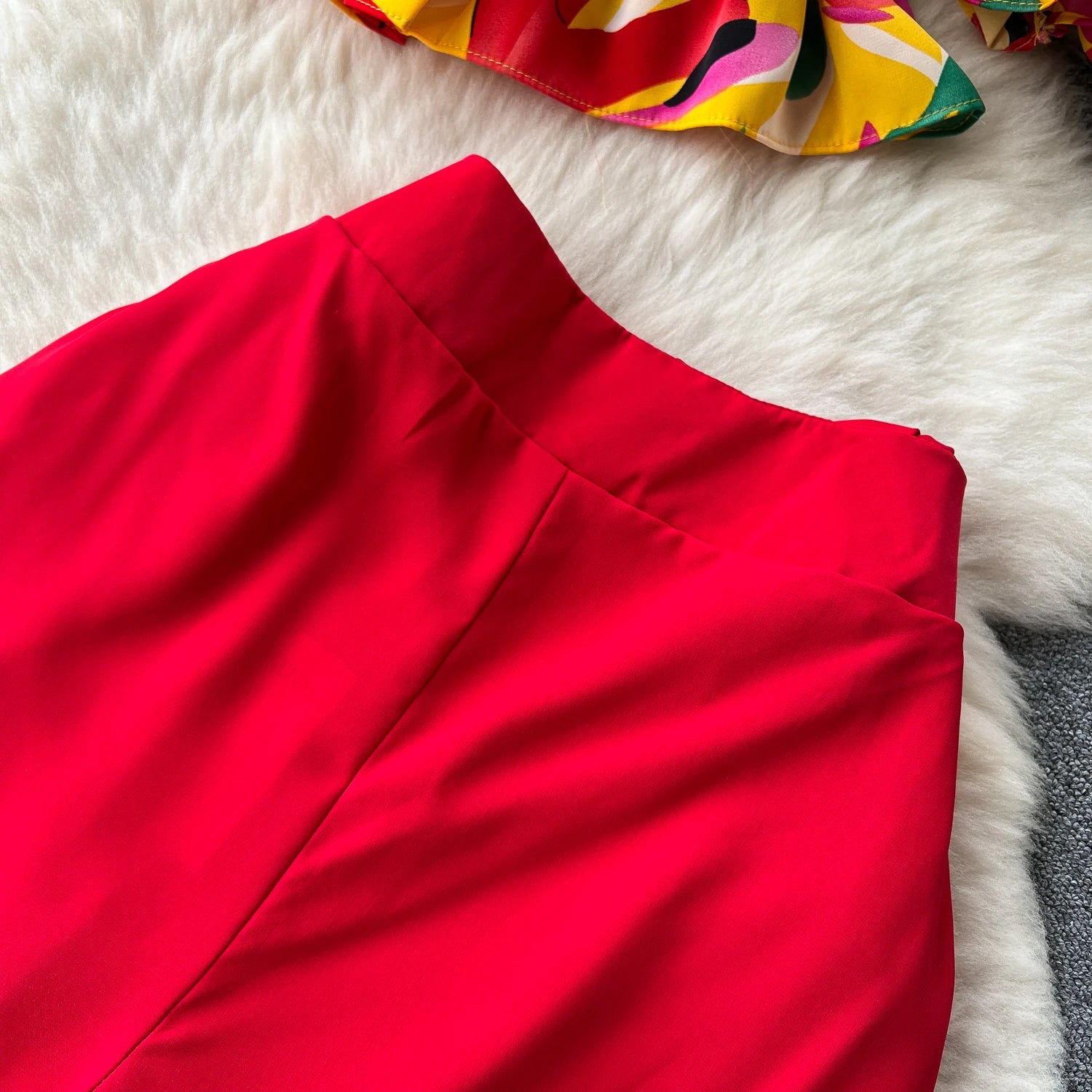 Ruffles Floral Print Elastic Waist Wide Leg Long Pants+Top Set